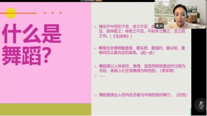 11月2日上午,首都师范大学舞蹈教育博士研究生何晓迪应邀为公司师生开展题为“走进舞蹈与创意舞动”的线上讲座。公司艺体教育系全体教师及23级小教专业、6年制初招音乐专业的100余人参与本次讲座。讲座由艺体教育系系主任易文颖副教授主持。